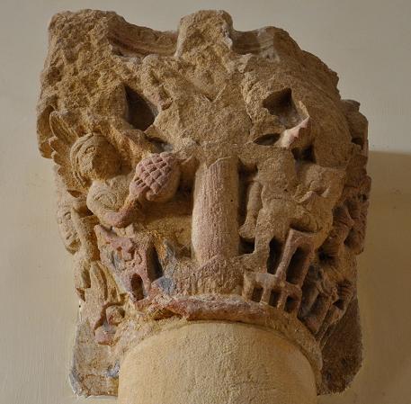 de deux chapiteaux sculptés, avec à gauche deux animaux